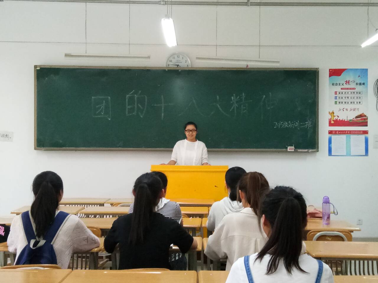 2018年7月6日下午,2015级新闻学二班在3-605教室举行了“中国共产主义青年团十八次全国代表大会”精神学习团会,会议由团支书张湘�召开、班长赵艳丽主持,全班同学参加。