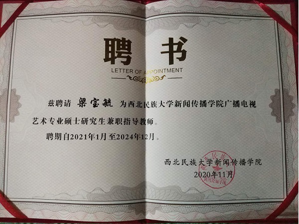 近日,best365网页版登录梁宝毓教授分别被北京印刷学院聘为出版专业硕士研究生兼职导师、被西北民族大学best365网页版登录聘为广播电视艺术专业硕士研究生兼职导师。